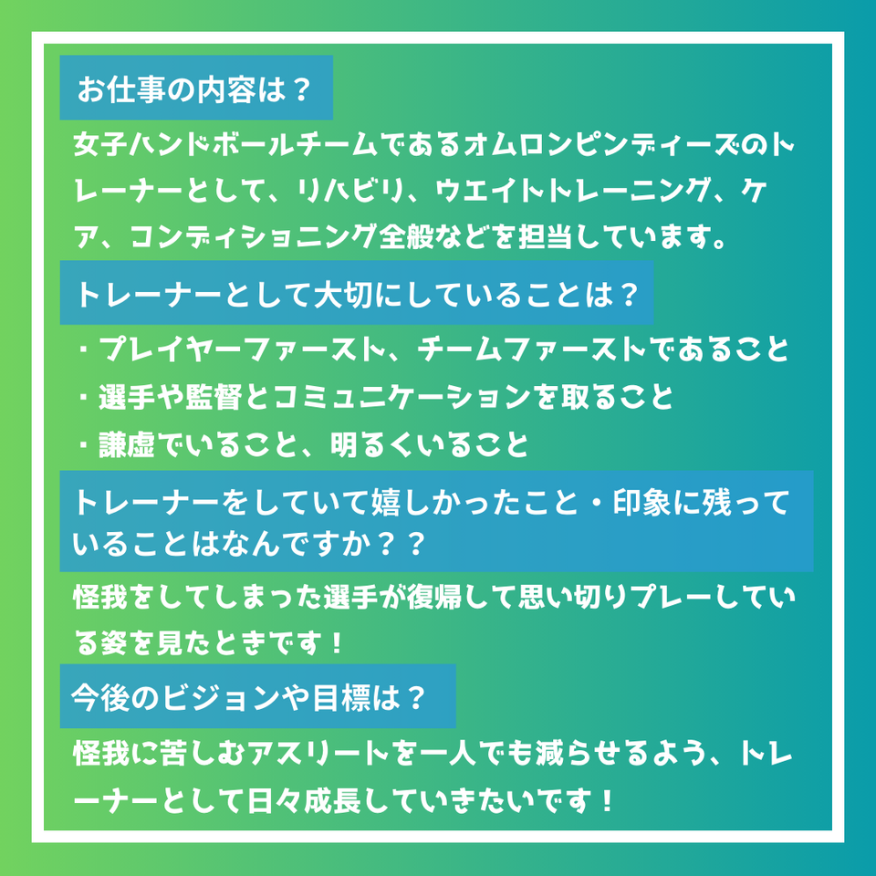 業務歴 | 2020年~ オムロンハンドボール部トレーナー |