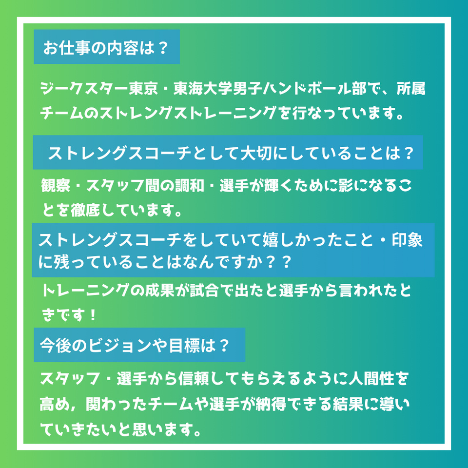 トレーナーになったきっかけ | 選手はいつまでもできないので、選手をサポートする仕事につきたいと思ったため |